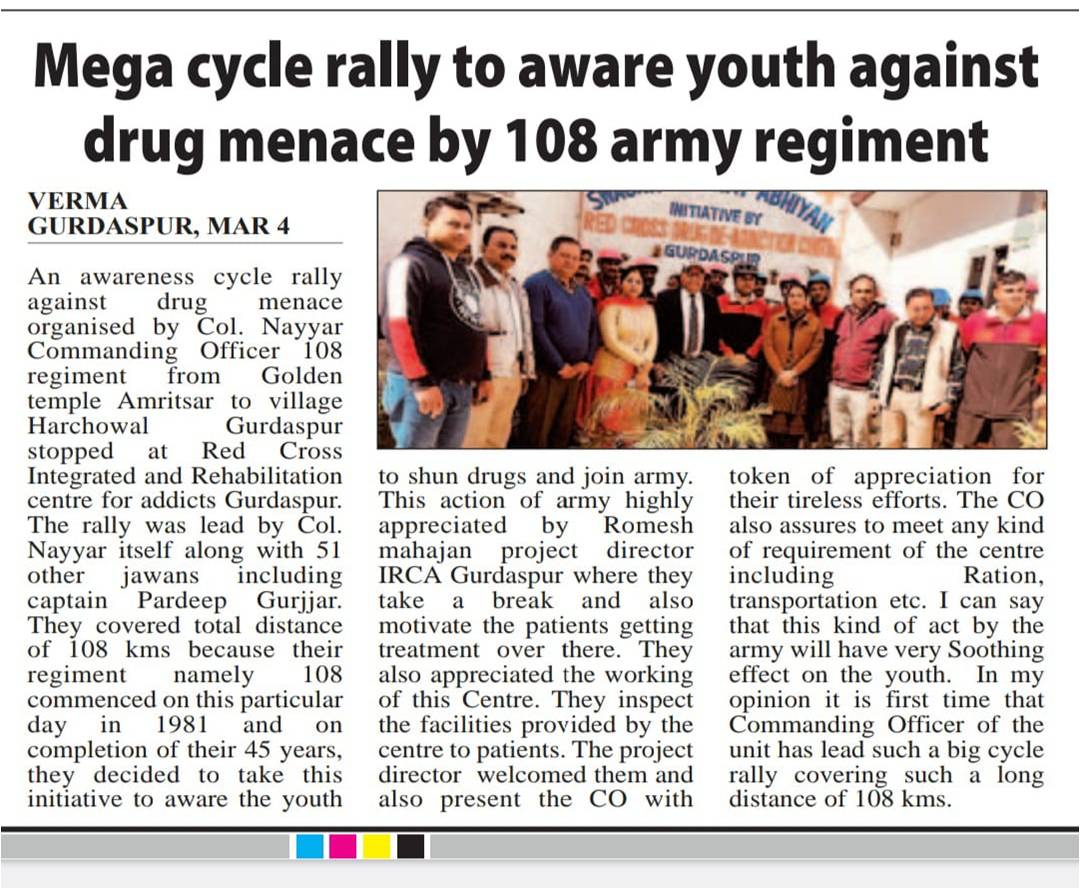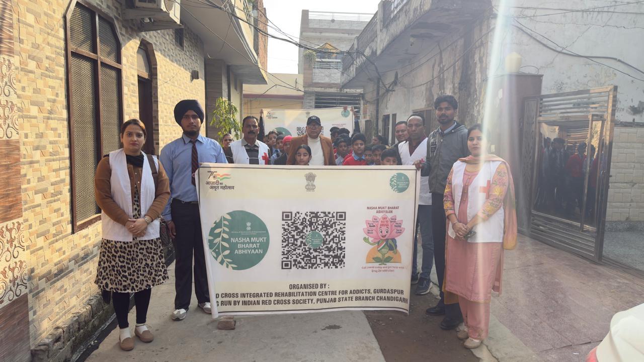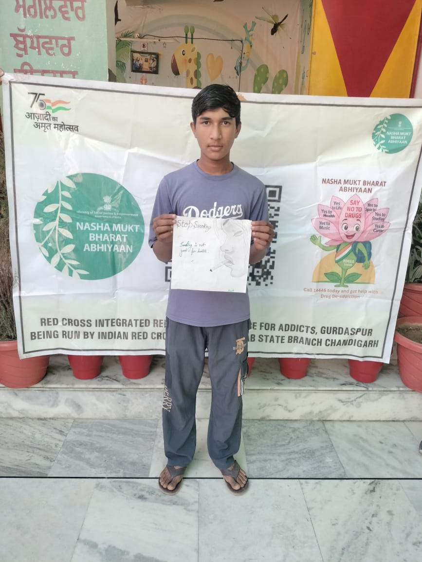 On the grand event of 5 years successful completion of Nasha Mukt Bharat abhiyan run by Ministry of Social justice and empowerment and Indian Red Cross Society Punjab State branch Chandigarh the Red Cross Integrated and Rehabilitation Centre GURDASPUR under the kind guidance and support of Sh. Shiv Dular Singh Dhillon IAS Retd, Secretary, Indian Red Cross society, punjab state branch chandigarh and district administration Gurdaspur organised multiple activities at various places like awareness seminar and pledge taking ceremony at Anand modern sr sec school Gurdaspur, Rattan sagar academy Gurdaspur, Bal Bhawna GURDASPUR, Salaria Auditorium, Army cantonment, Tibri, Tagore memorial sr sec. School and Centre premises itself followed by a rally against drug abuse with the students of Anand modern sr sec school and staff of IRCA and a painting competition on this theme amongst students of slum area school Gurdaspur.