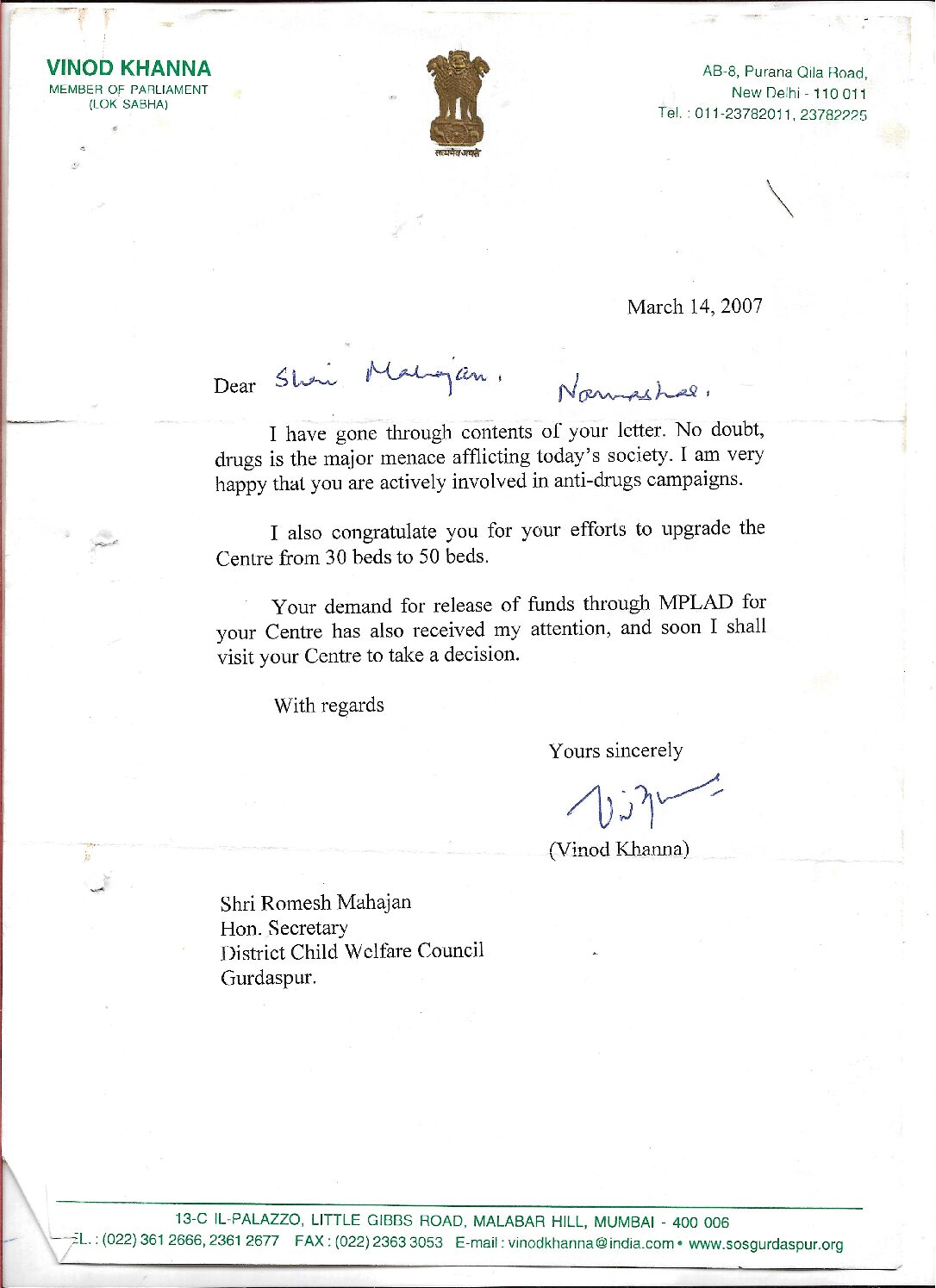 Appreciation by Vinod Khanna 2007