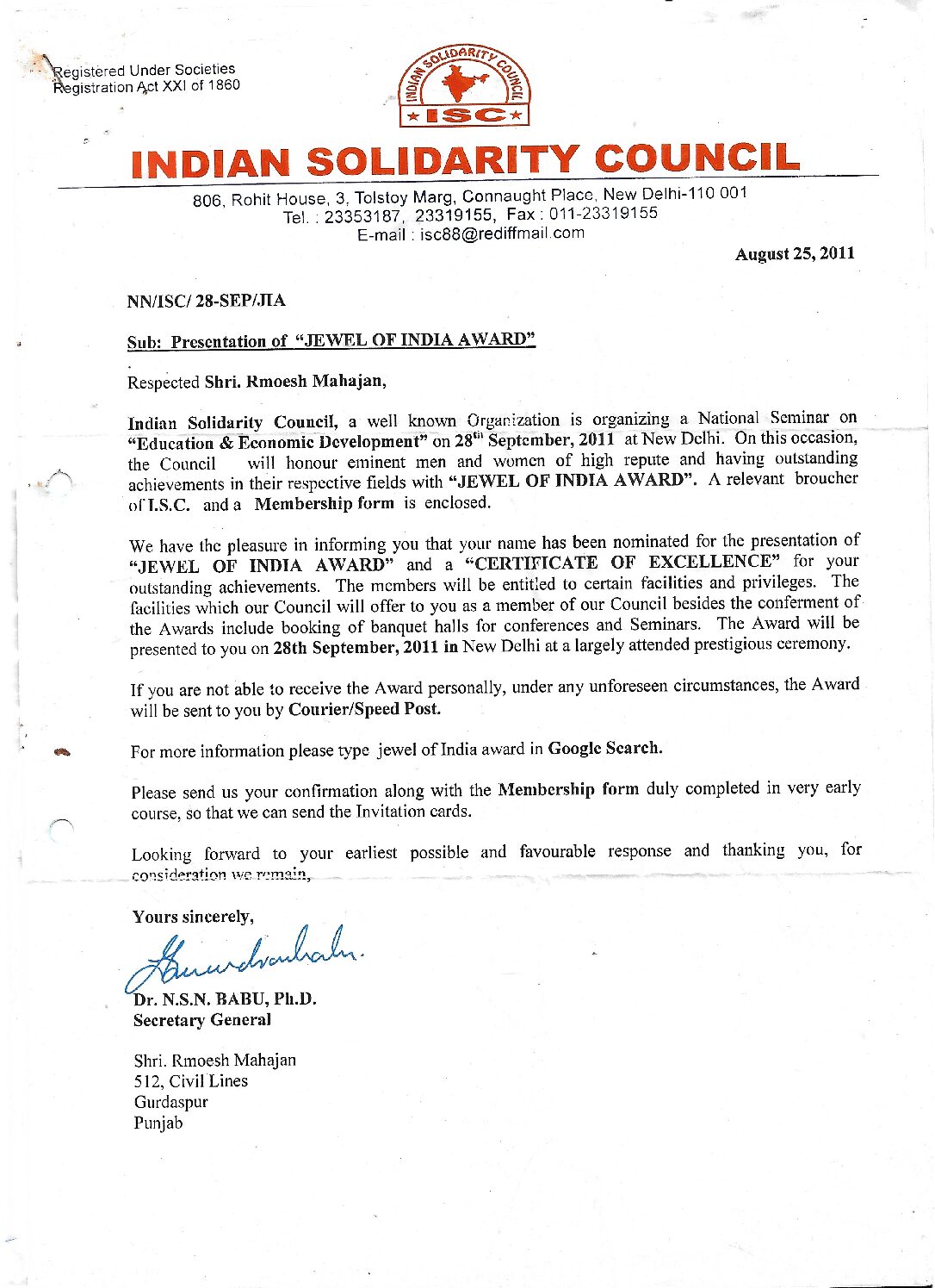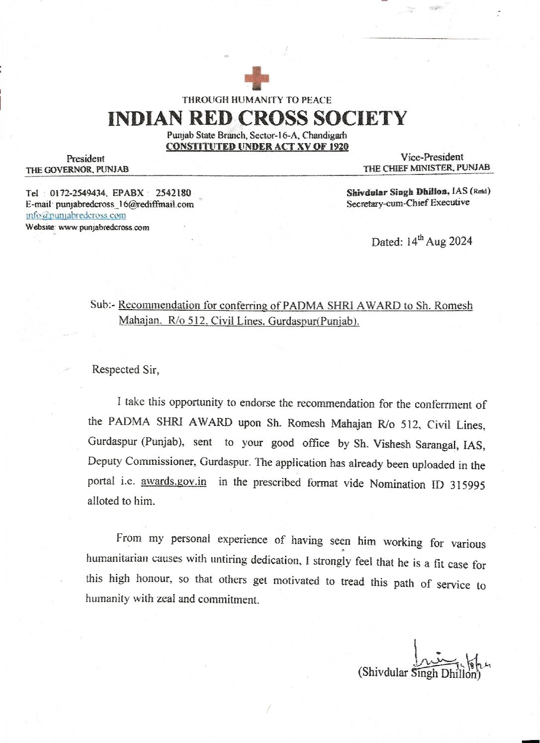 Recomendation by Secretary ,Red Cross Punjab